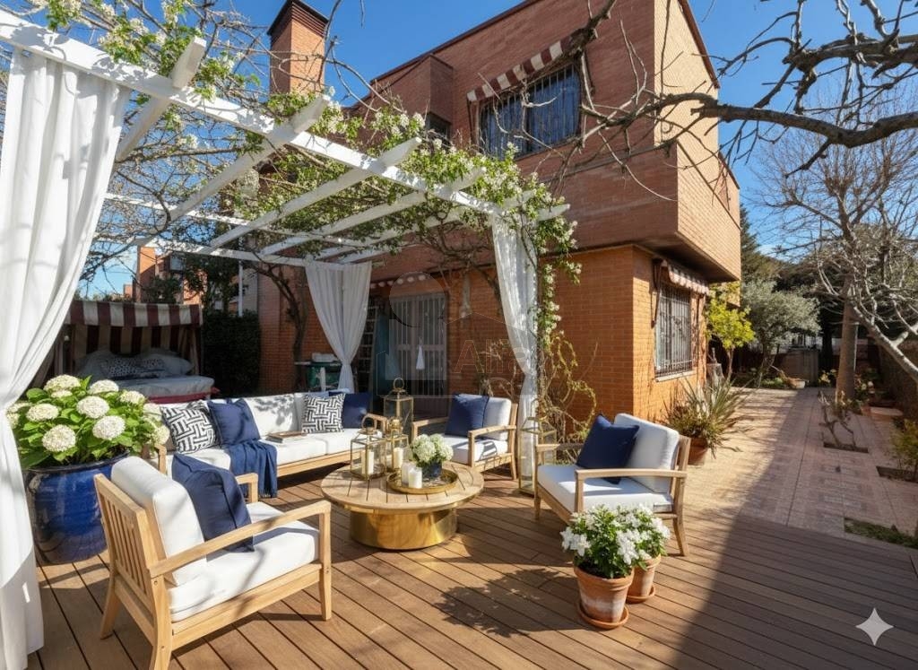 Al acceder a la finca nos recibe una zona solada de fácil mantenimiento, con jardín perimetral, plantas consolidadas, árboles frutales y un bonito olivo. Dispone además de plaza de garaje cubierta y una fantástica barbacoa de obra. Al fondo encontramos uno de los rincones más especiales de la casa: una amplia terraza con pérgola natural formada por una parra que en temporada proporciona una sombra maravillosa. Desde aquí tenemos acceso directo al salón, ideal para reuniones familiares y con amigos.