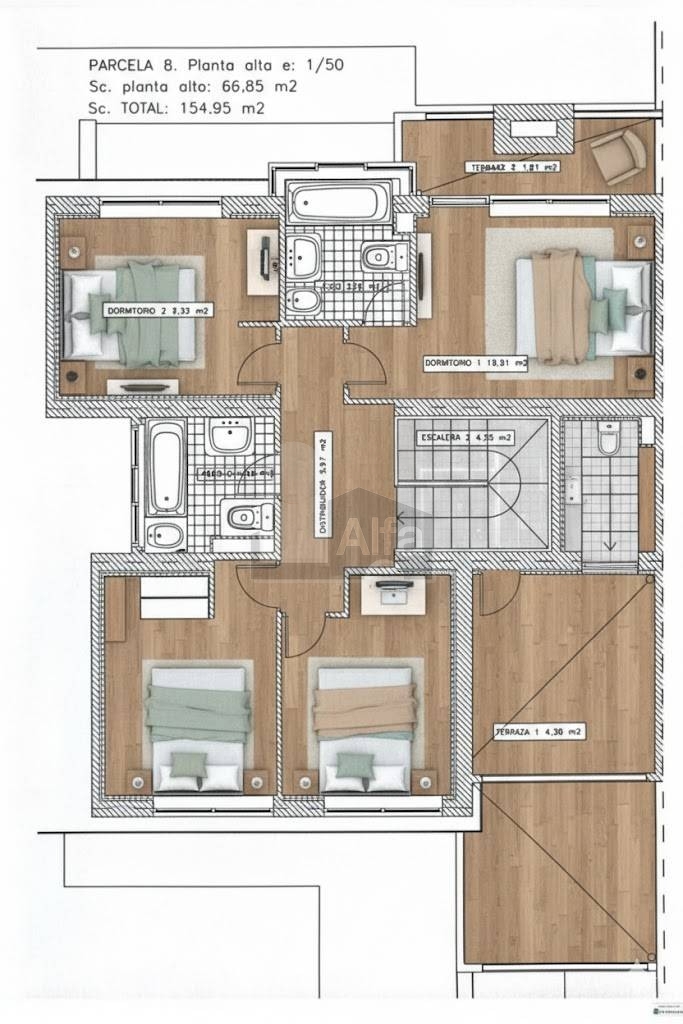 En la primera planta se distribuyen cuatro dormitorios, todos con armarios empotrados. El dormitorio principal dispone de baño en suite, mientras que un segundo baño completo con bañera da servicio al resto de habitaciones. Desde esta planta existe la posibilidad de instalar escalera y habilitar la buhardilla, aportando aún más espacio a la vivienda.